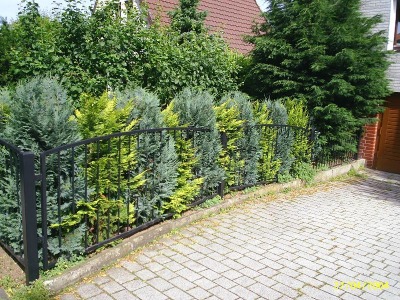 Schmiedeeiserner Gartenzaun mit Rundbogen. Die einzelnen Segmente wurden den Geländeverlauf ( Neigung ) angepasst .